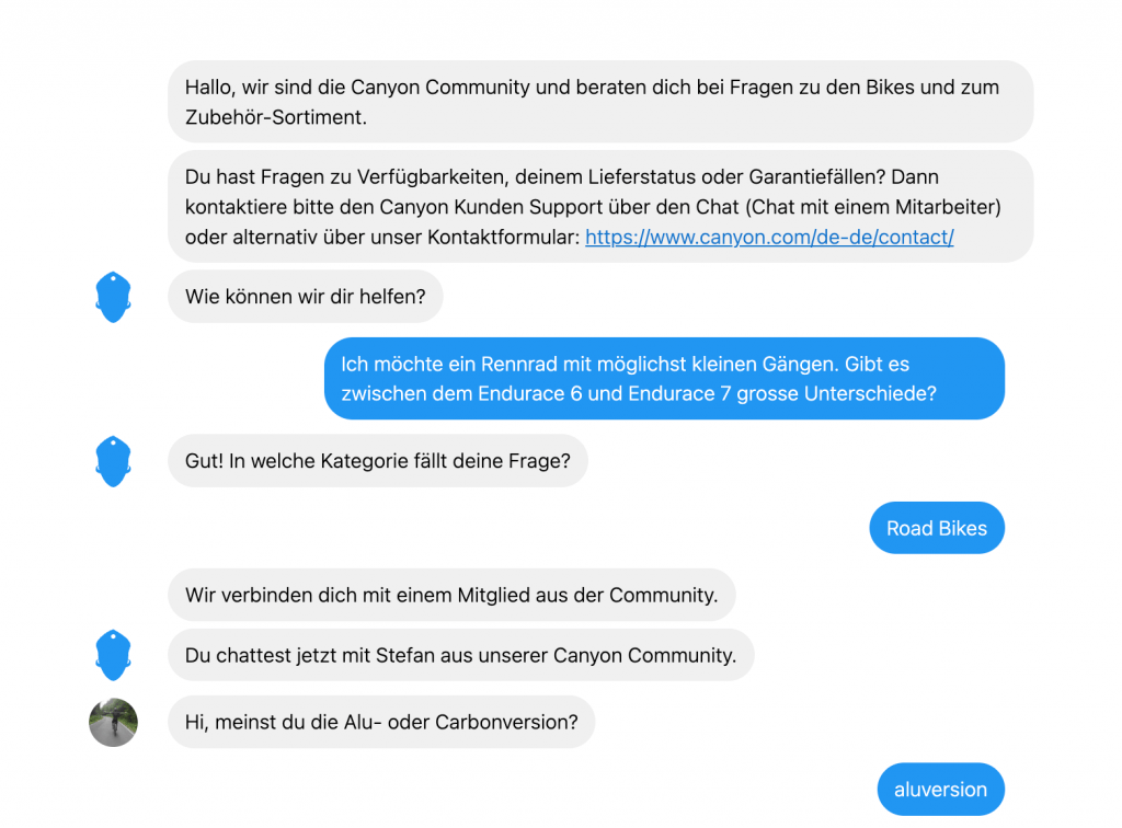 Das Gespräch wurde fortgesetzt, die Frage war sehr spezifisch, führte aber zu einem sehr zufriedenen Kunden, der genau die Informationen erhielt, die er brauchte. Stefan verknüpfte dabei seine Canyon Erfahrungen mit seinen Branchenkenntnissen.