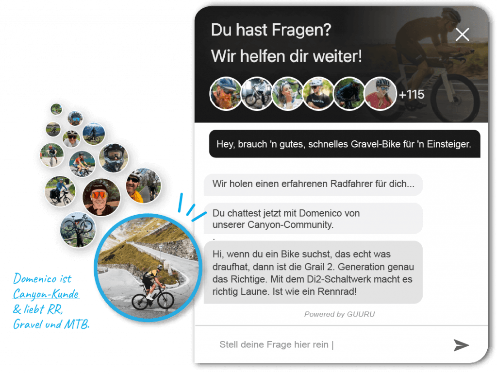 Beispiel: Ein Canyon Guuru ist nicht nur ein aktiver Nutzer von Canyon Bikes, sondern auch ein erfahrener Radfahrer. Alle Canyon Guurus haben sowohl einen Wissenstest als auch einen Kommunikationstest bestanden. Das garantiert eine kompetente, markenkonforme und vertrauenswürdige Produktberatung – live und authentisch.